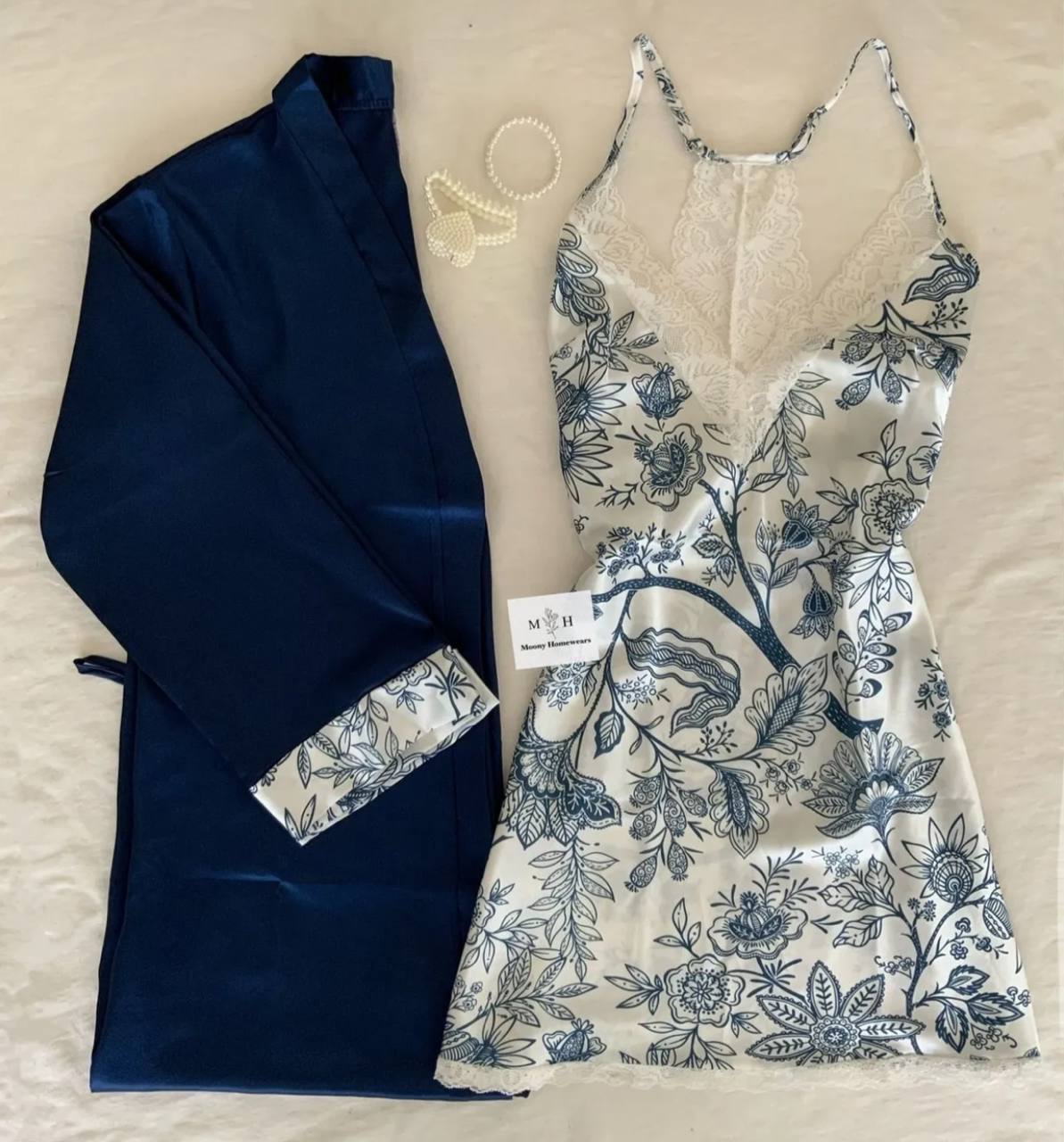 طقم نوم من قطعتين فستان قصير ورورب من قماش الساتان الفاخر بنقشه الورود وتصميم انثوي راقٍ