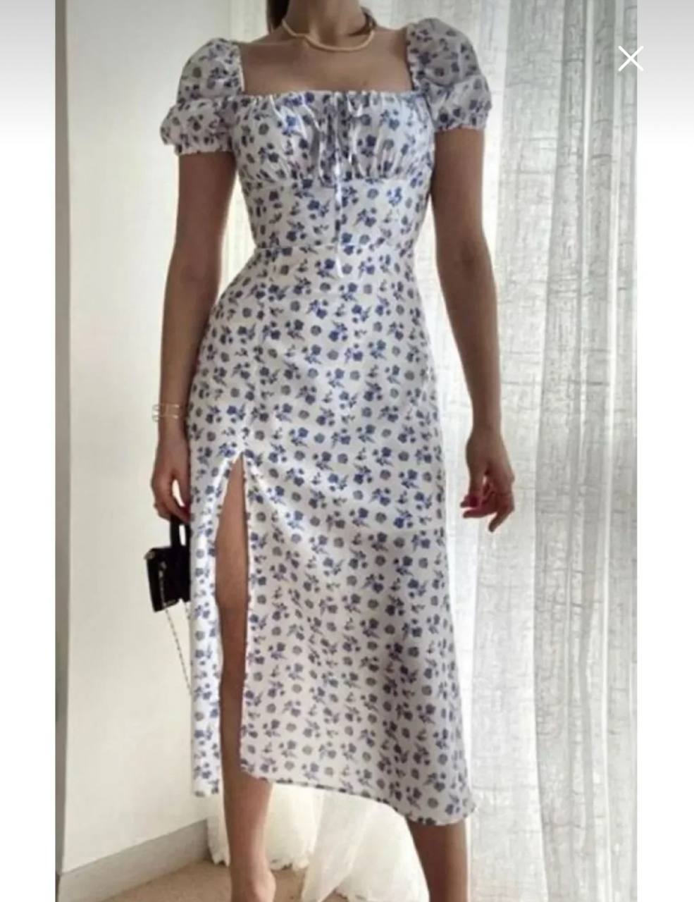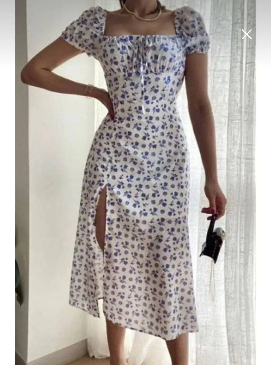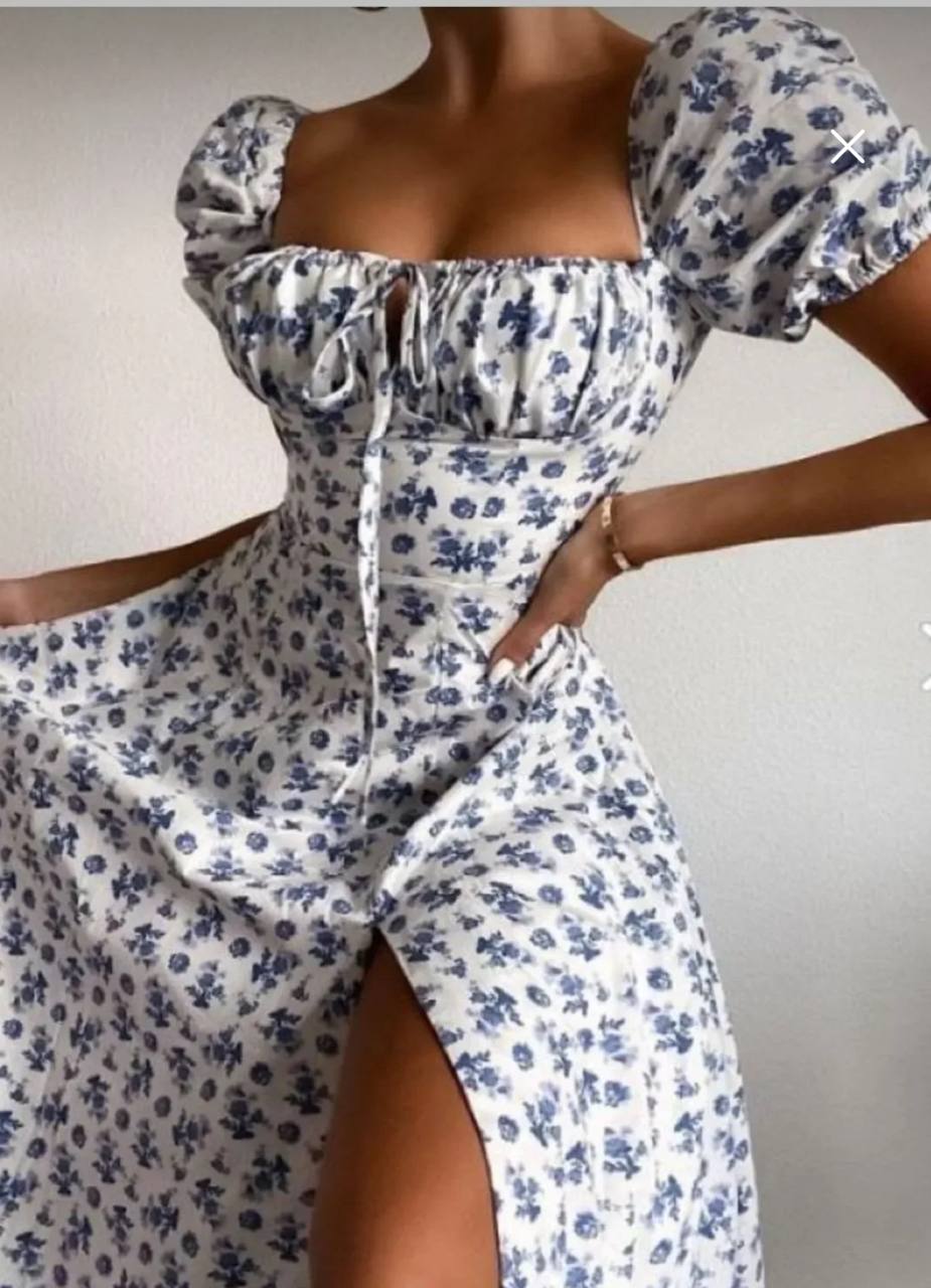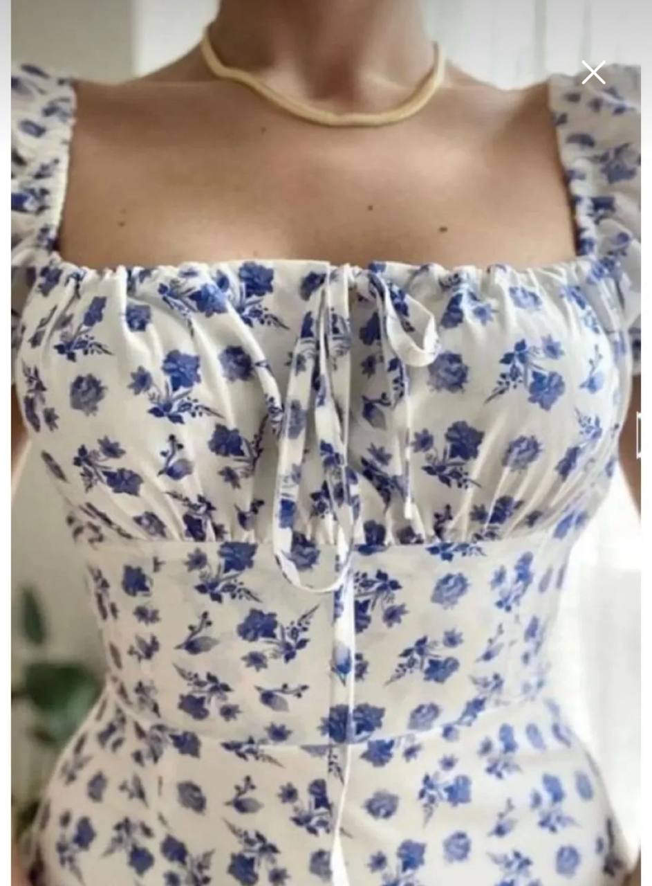 فستان ابيض بنقشه الزهور الزرقاء