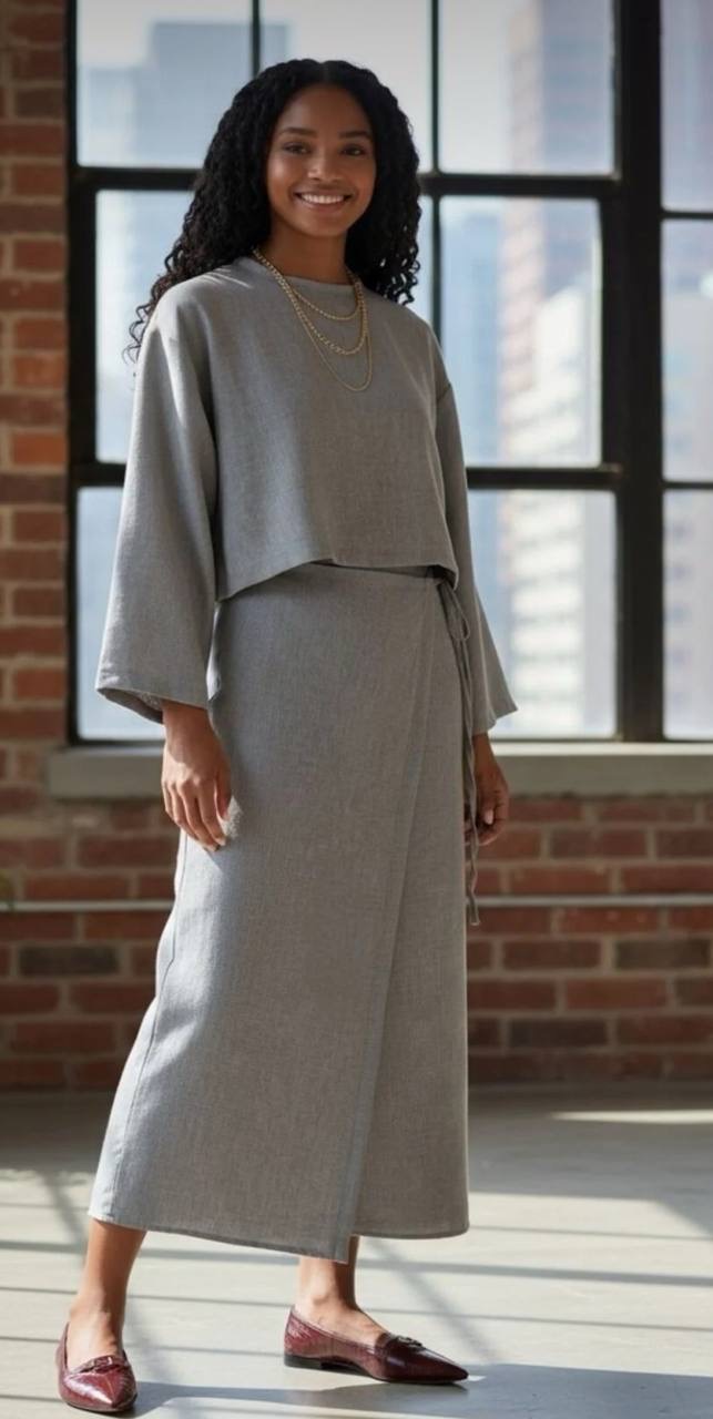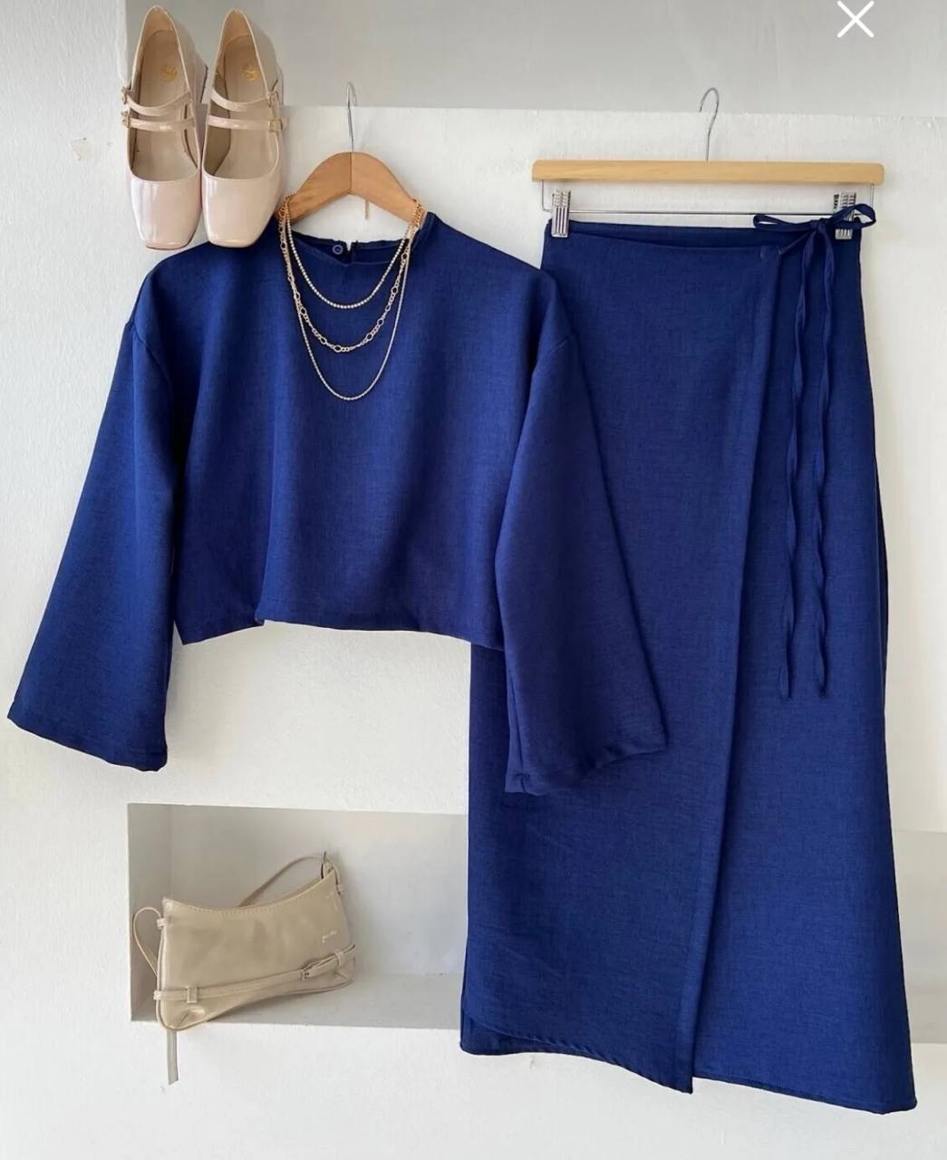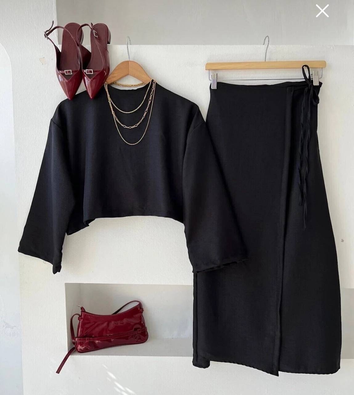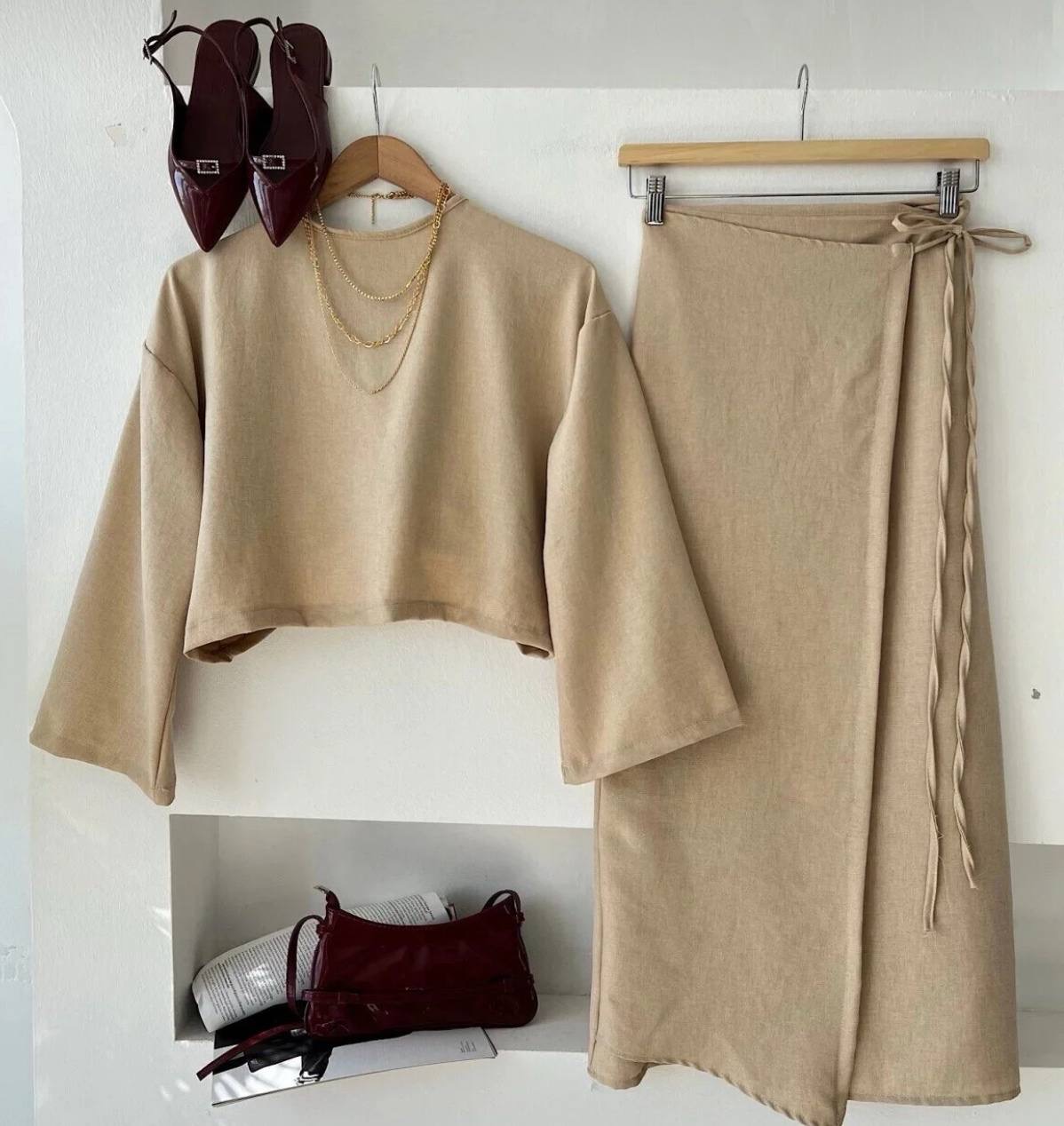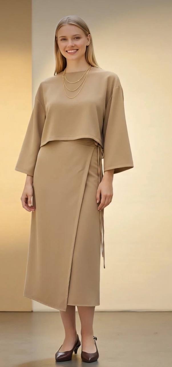 تنوره لف مع توب قصير بأكمام طويله وياقه دائريه