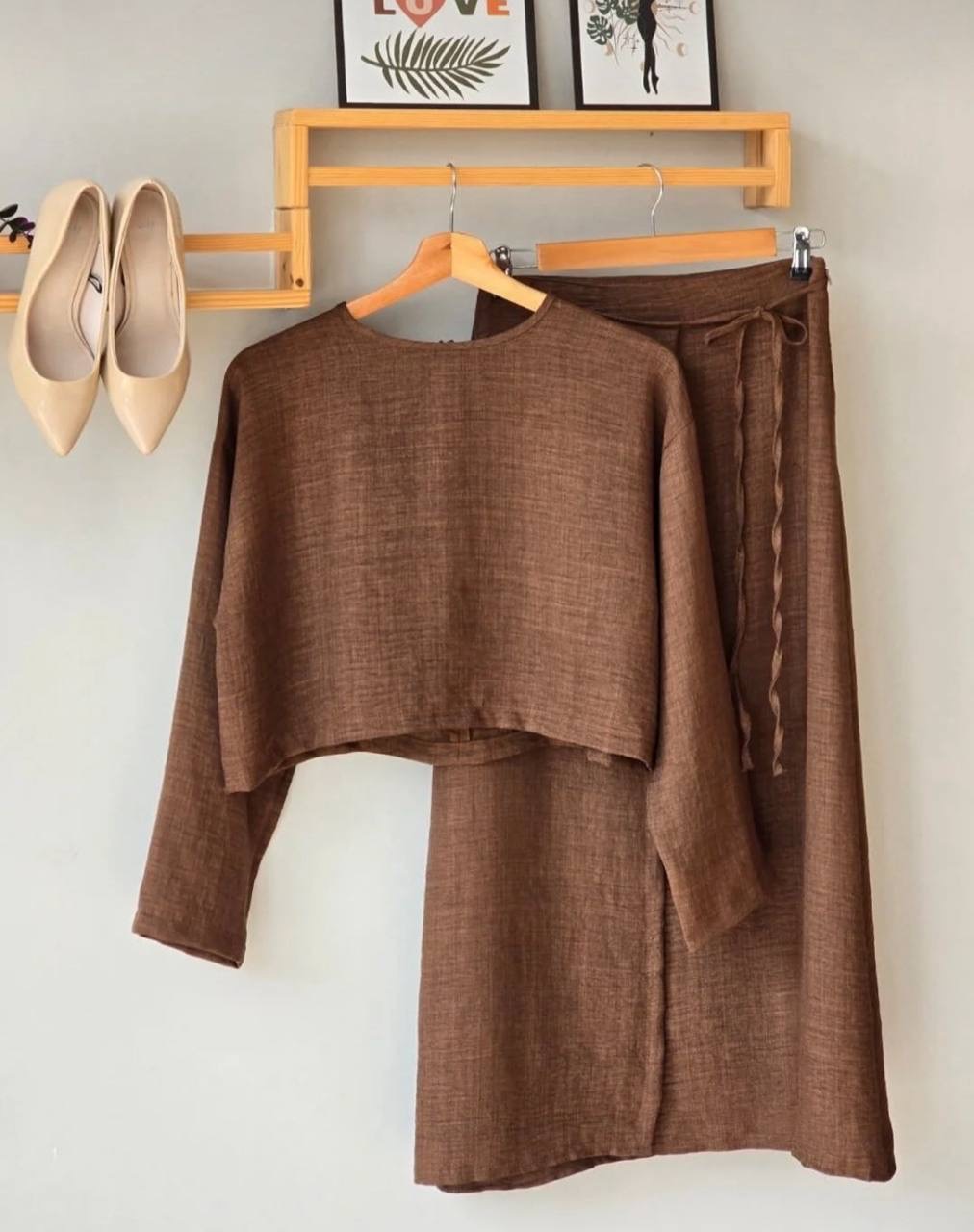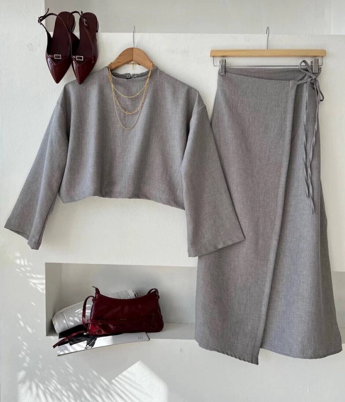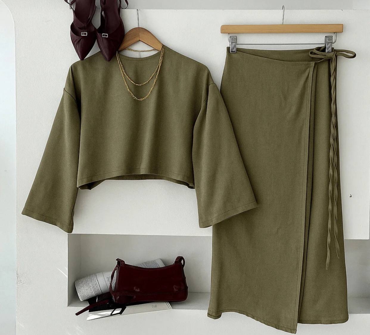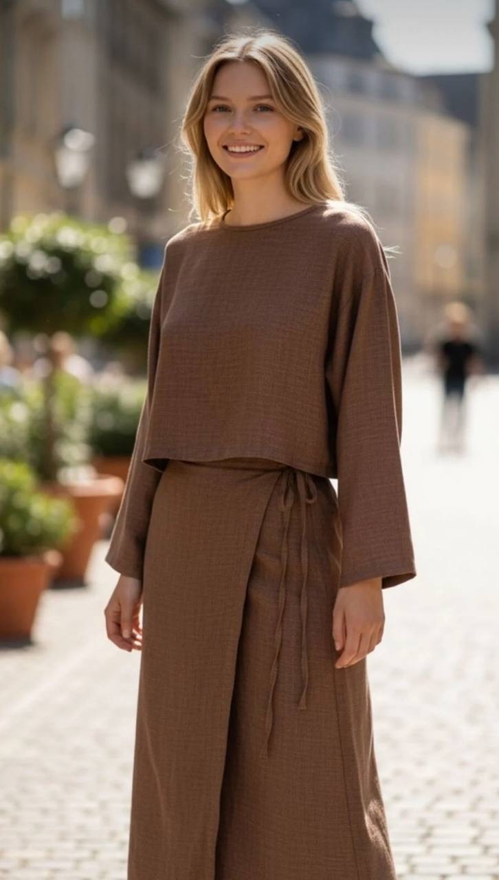 تنوره لف مع توب قصير بأكمام طويله وياقه دائريه