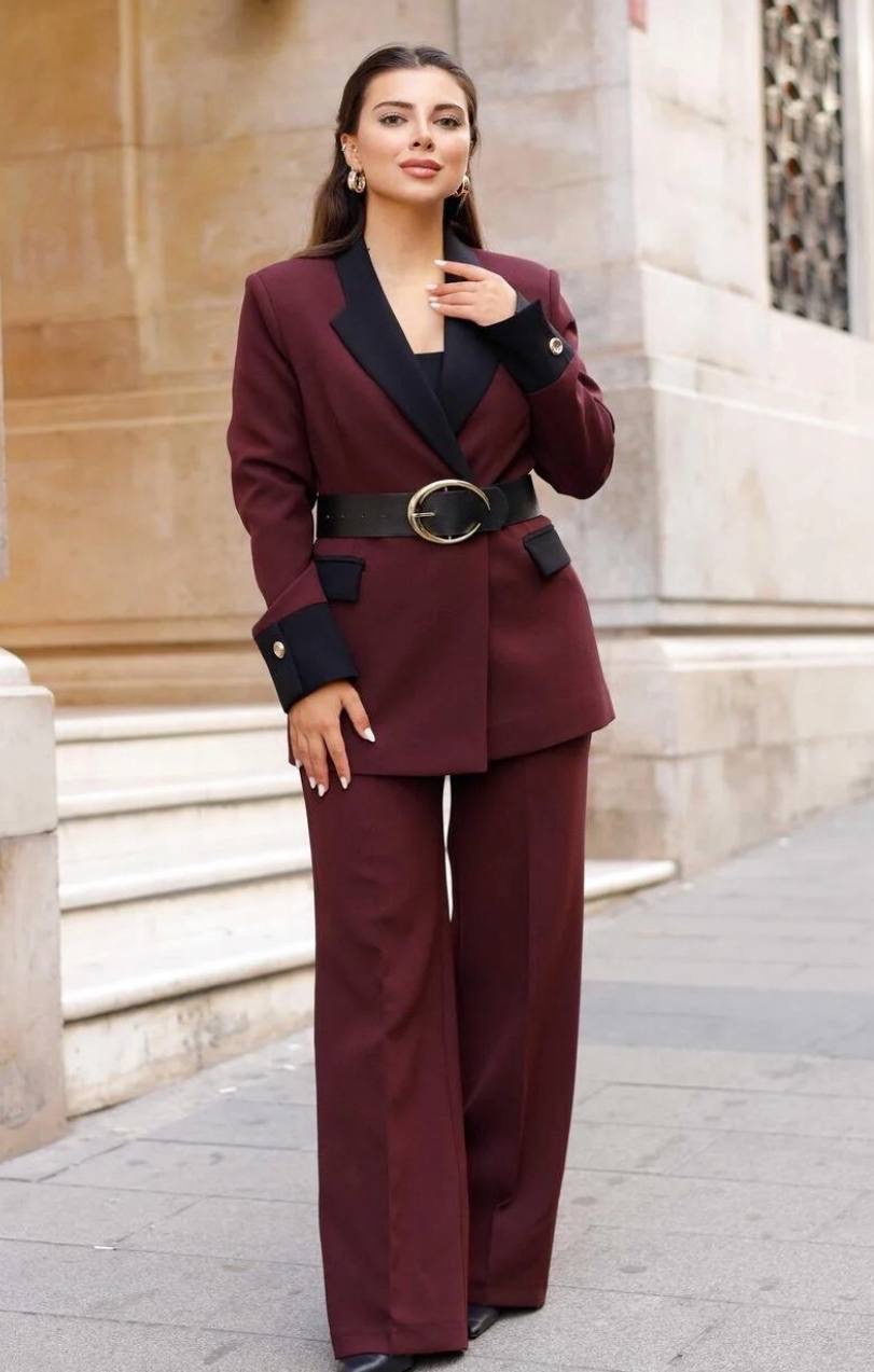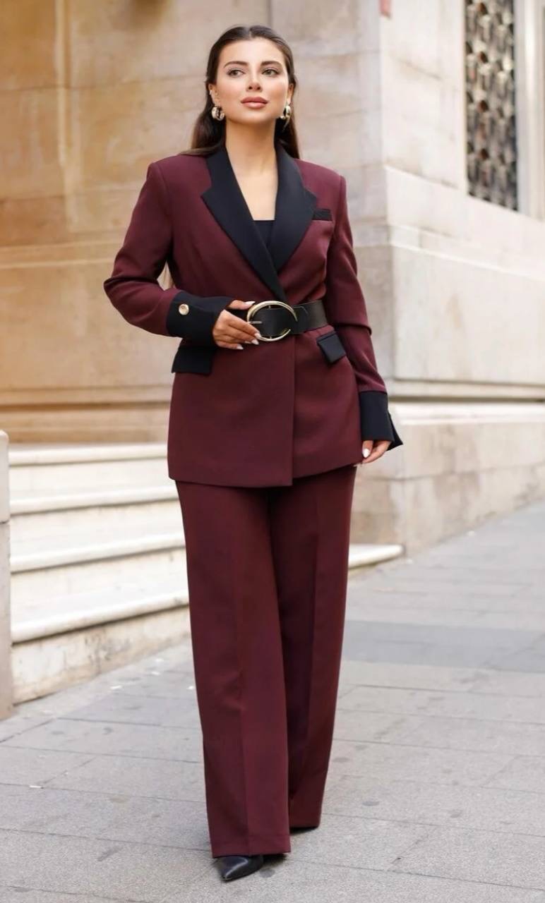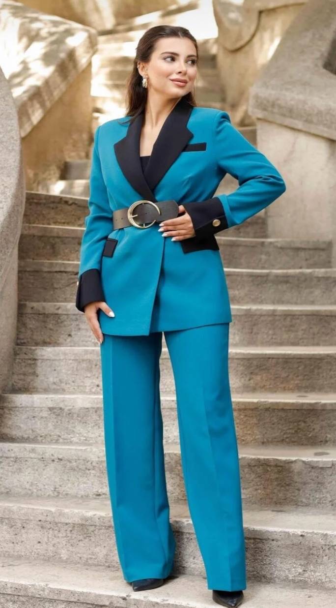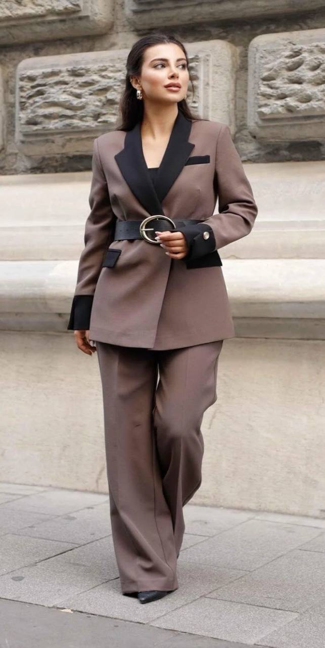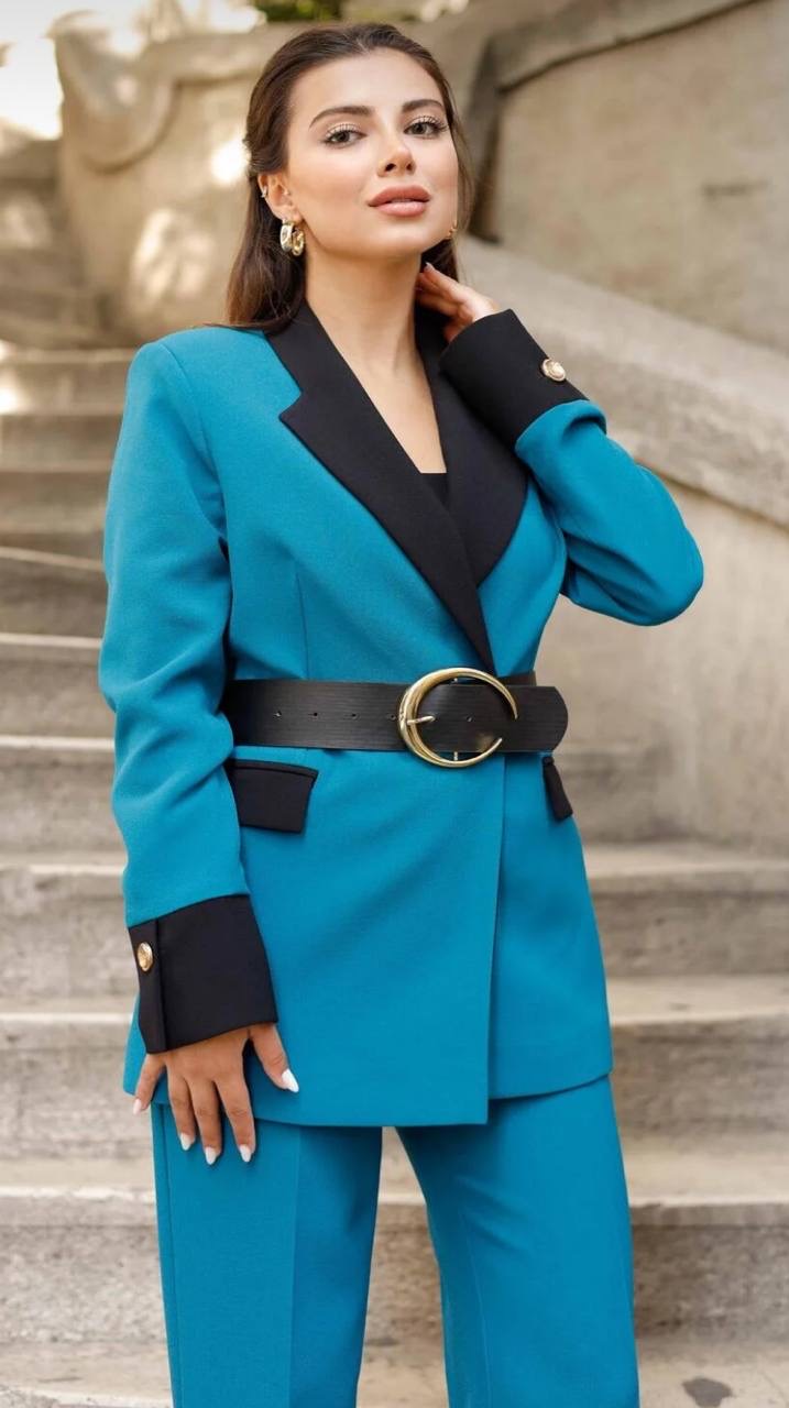 بدله نسائيه بياقه مزدوجه مصممه بلونين مع حزام للخصر