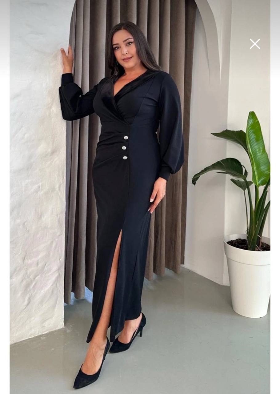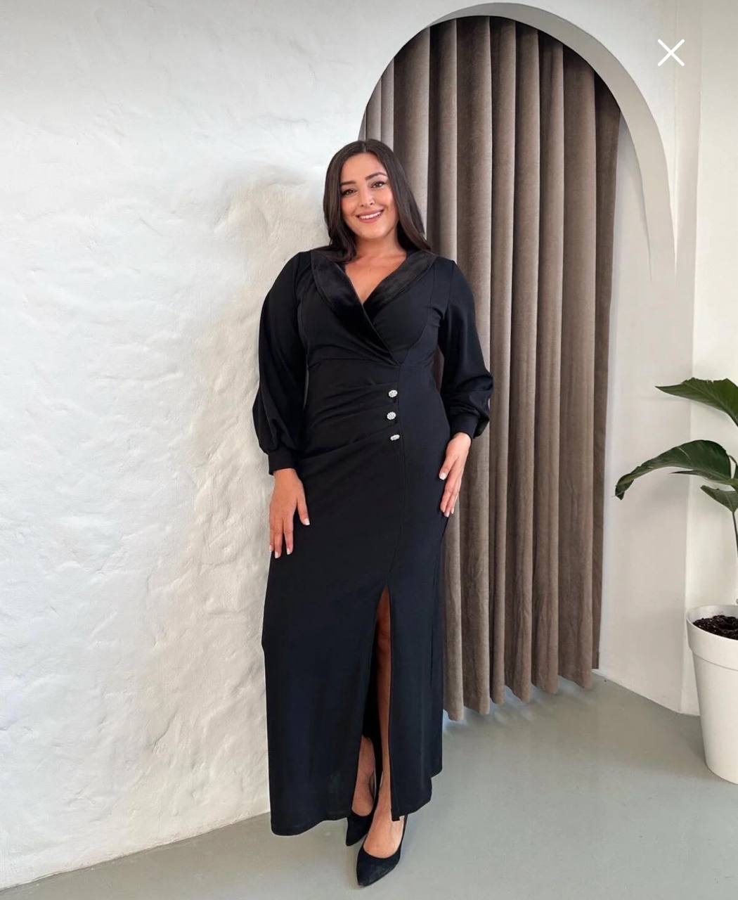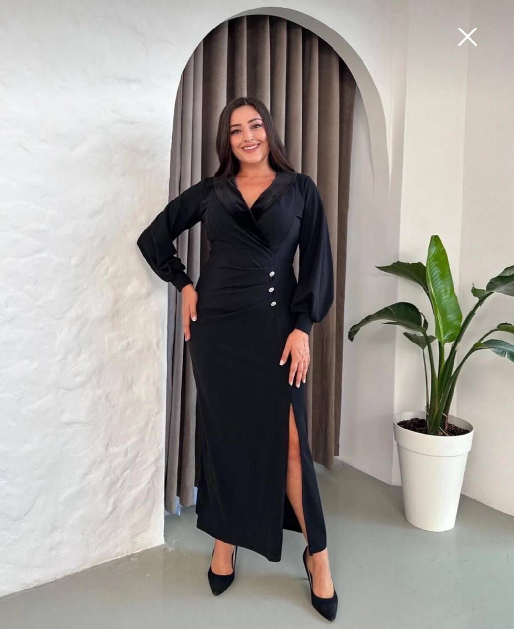 فستان سهره بتصميم ياقه من الساتان مع طيات خصر بتزيين الازرار الحجريه