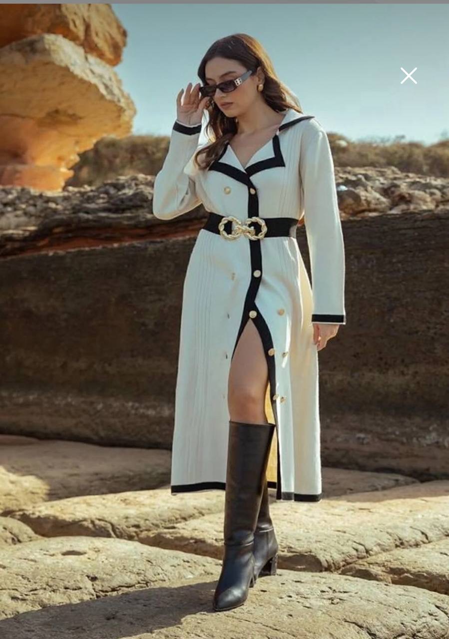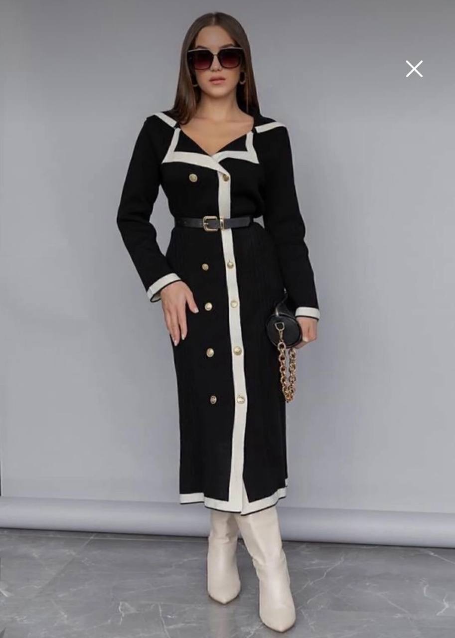 فستان تريكو انيق بطول متوسط من لونين الابيض والاسود مع الازرار الذهبيه للمسه انثويه وانيقه