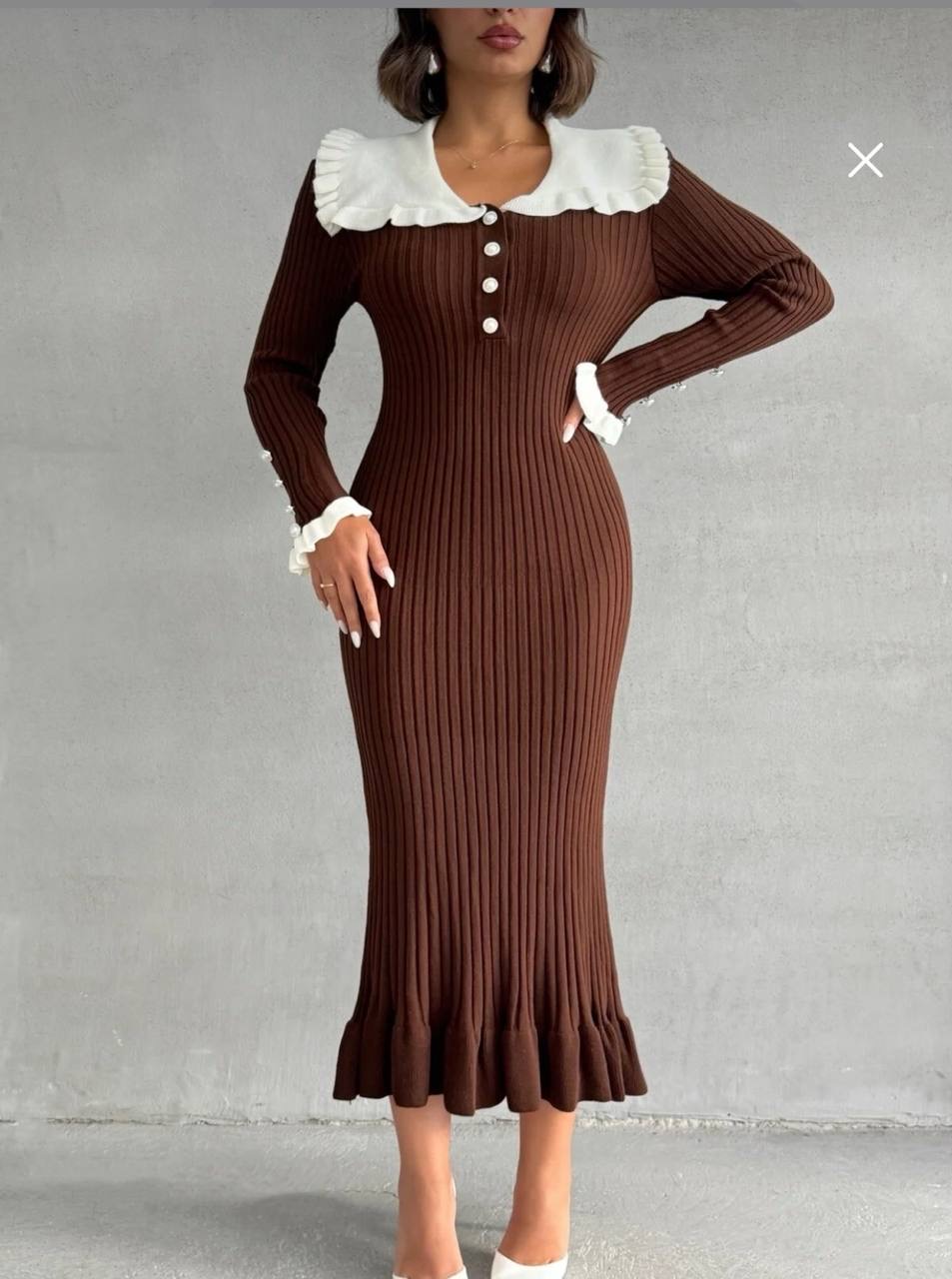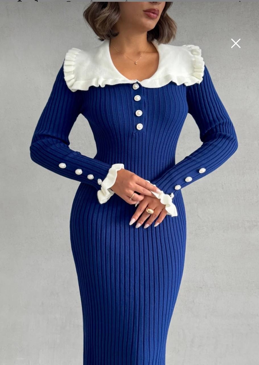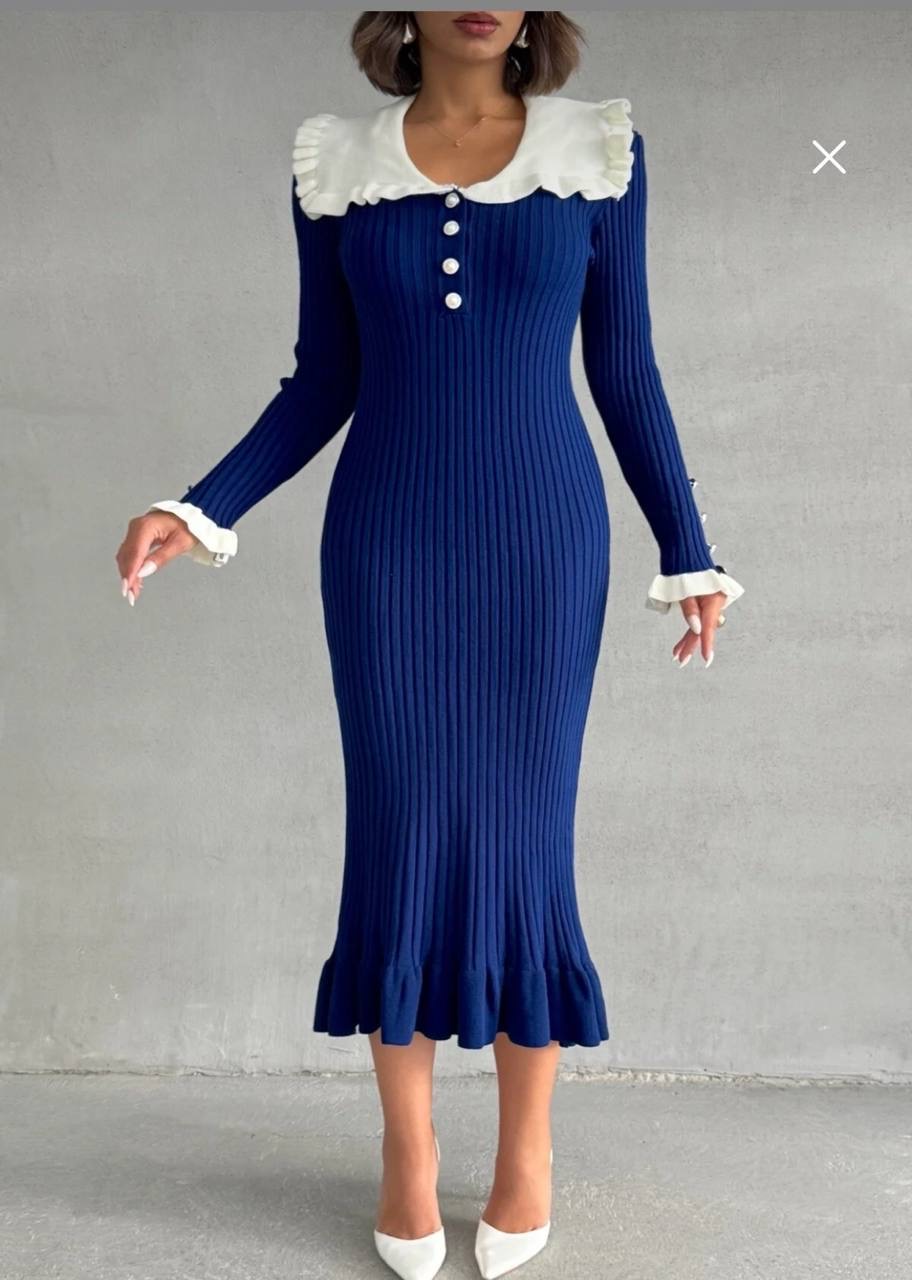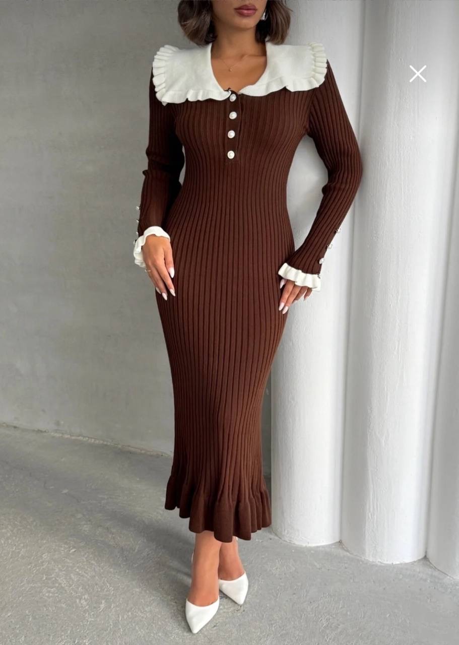 فستان تريكو طويل من القماش الناعم المحبوك بتزيين الكشكش على الياقه والاكمام