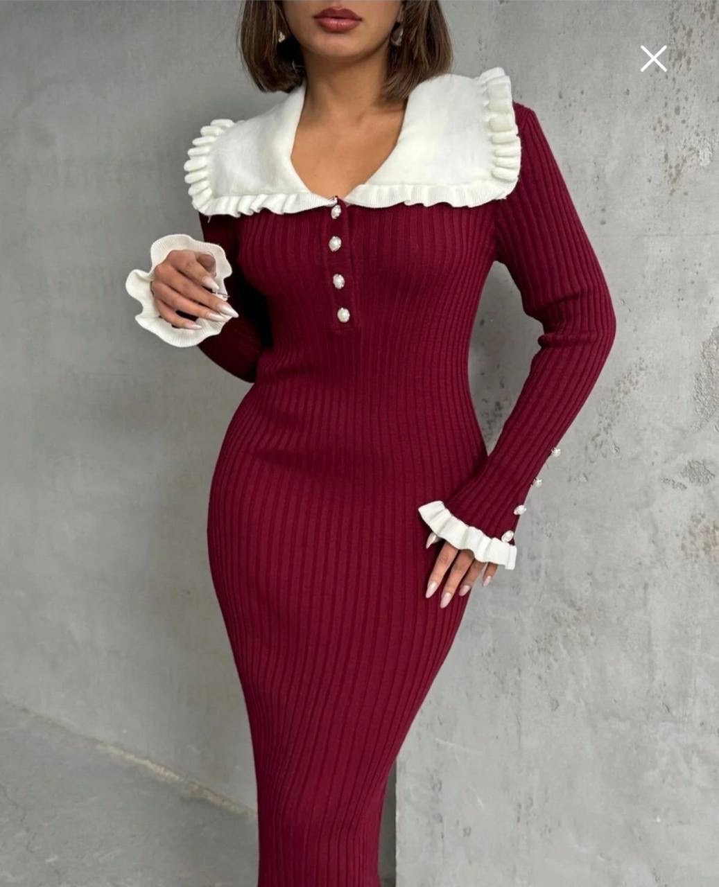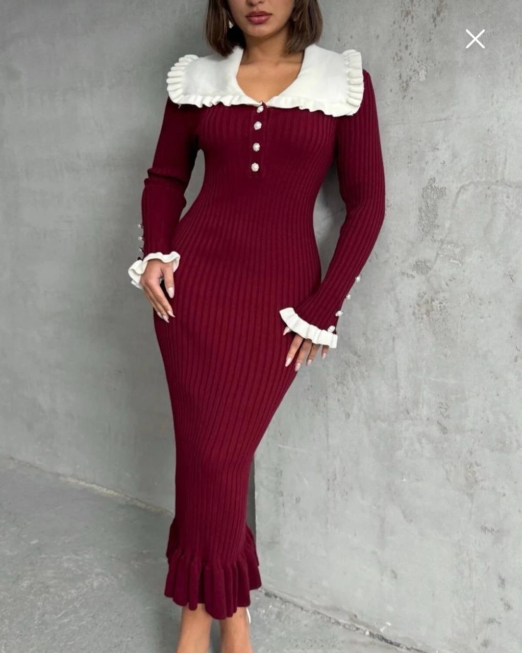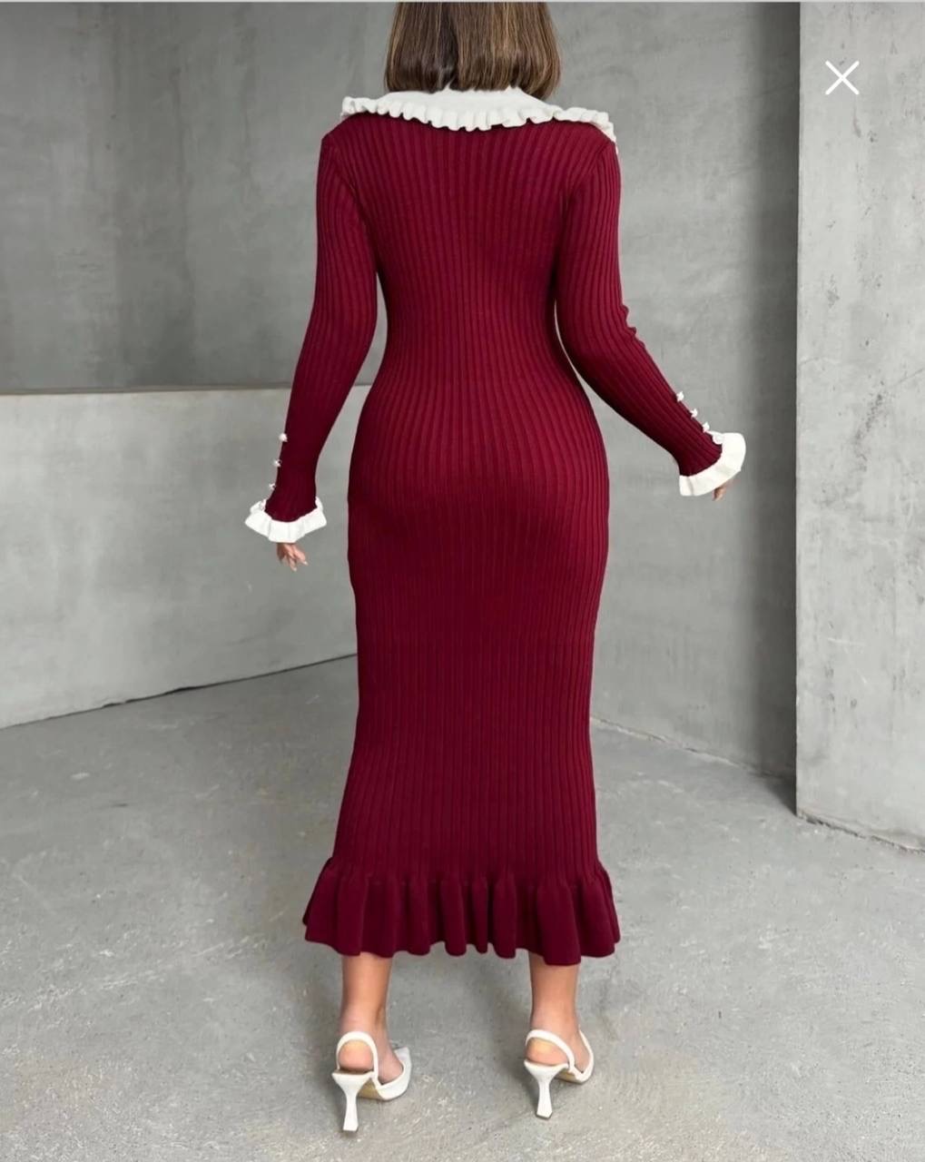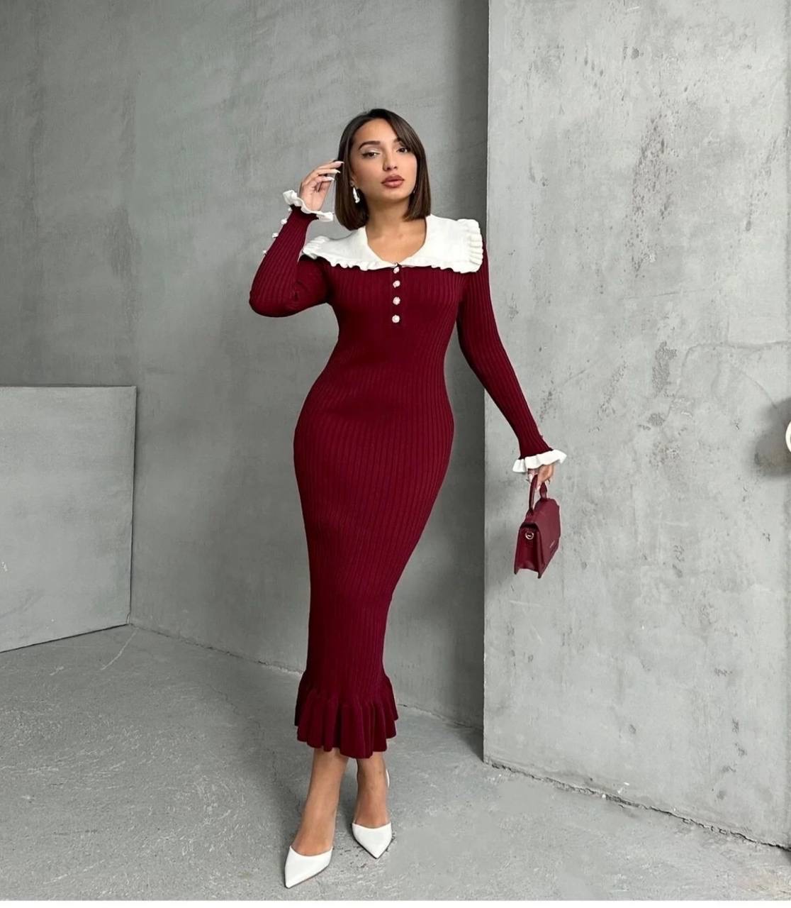 فستان تريكو طويل من القماش الناعم المحبوك بتزيين الكشكش على الياقه والاكمام