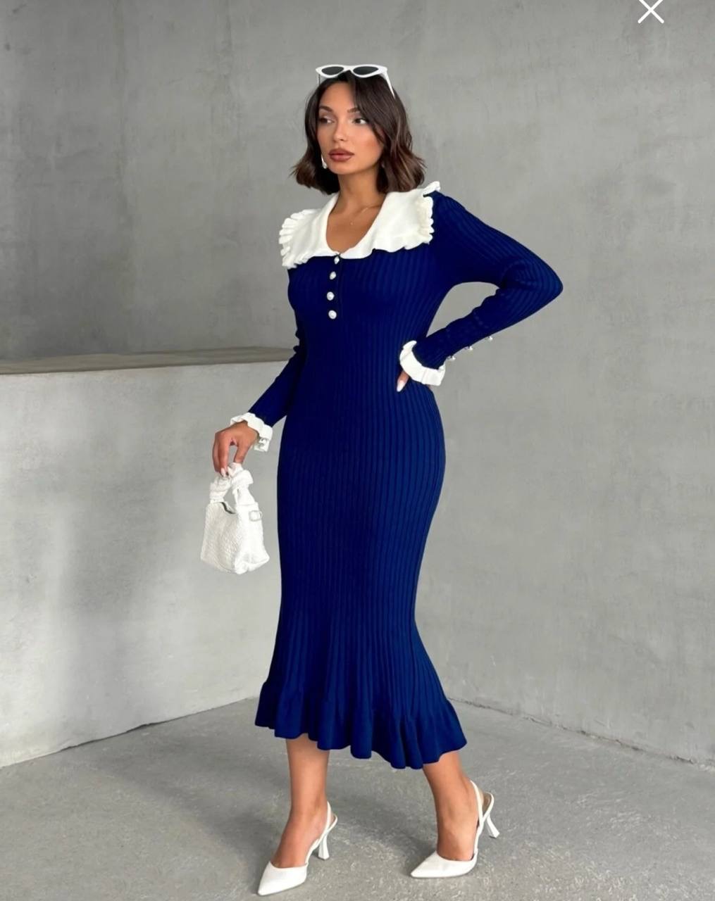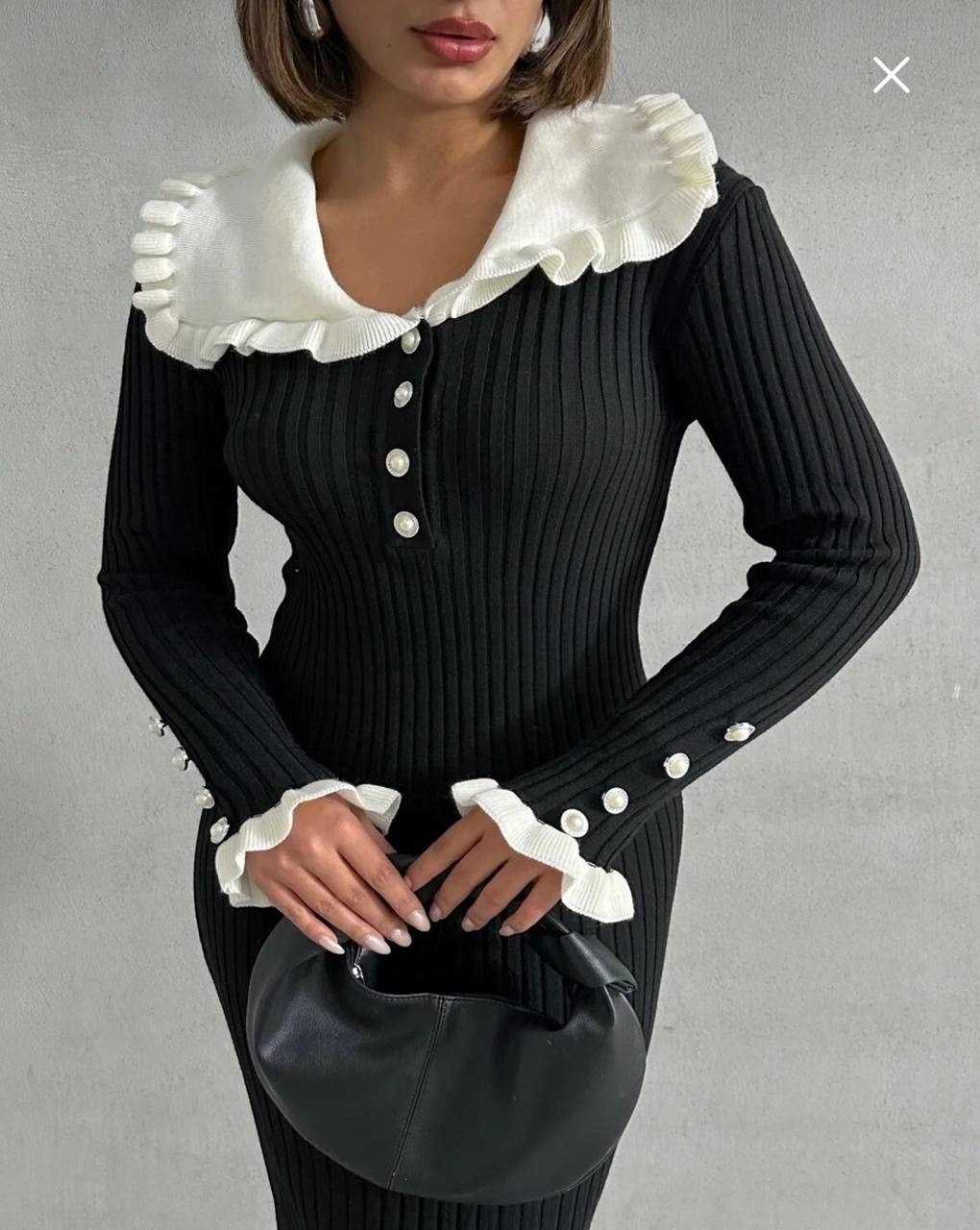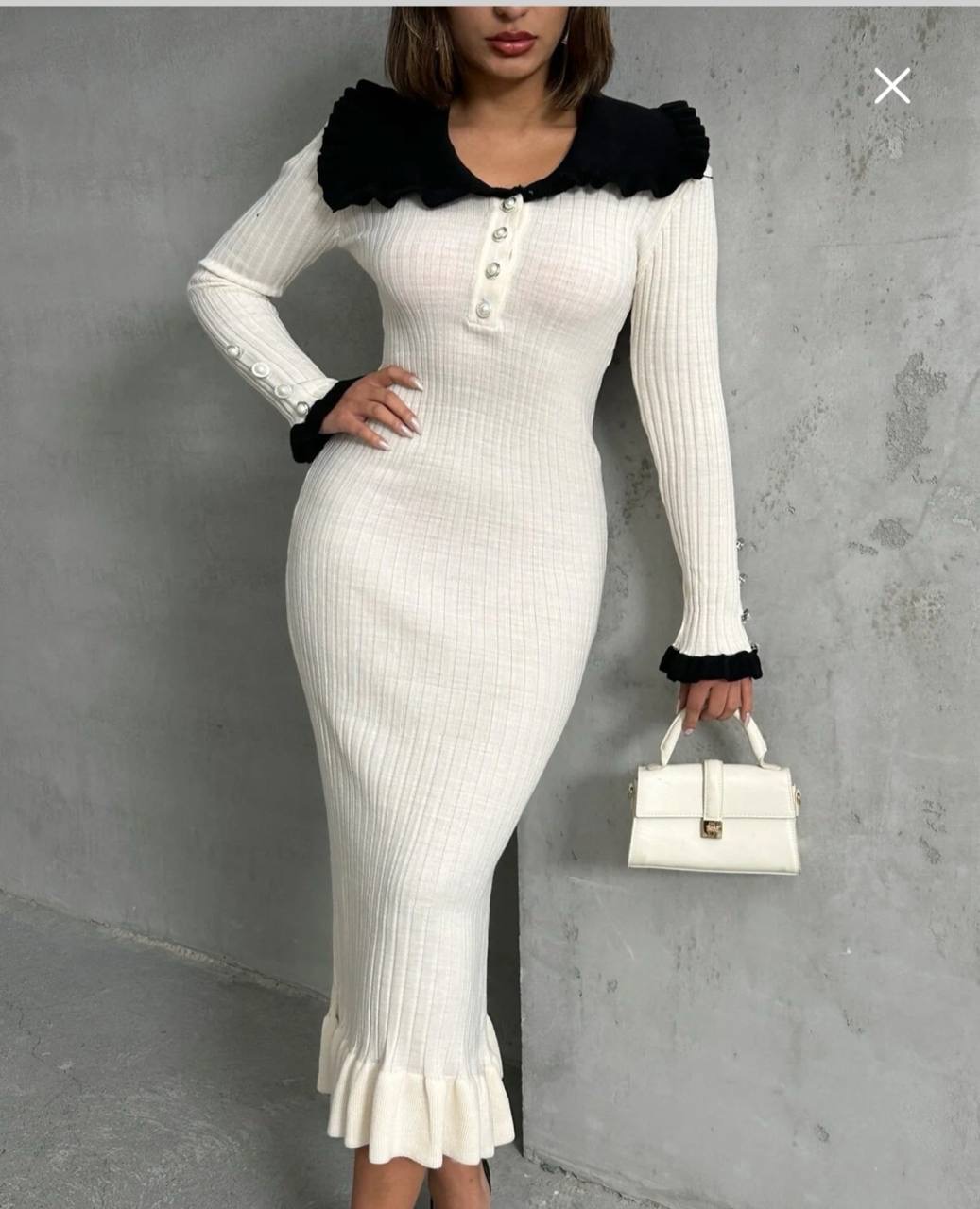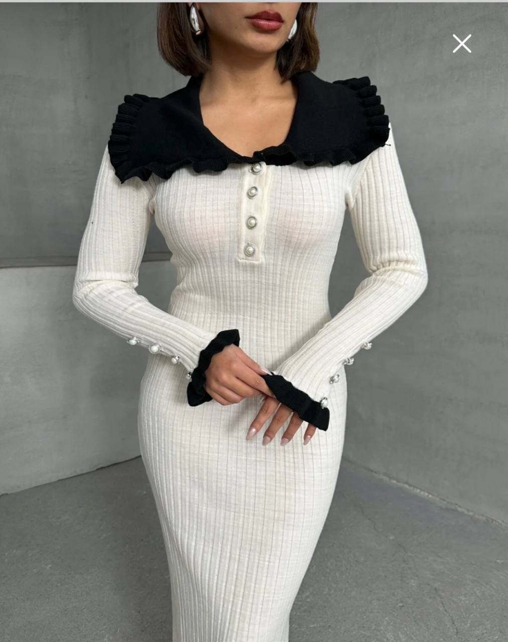 فستان تريكو طويل من القماش الناعم المحبوك بتزيين الكشكش على الياقه والاكمام