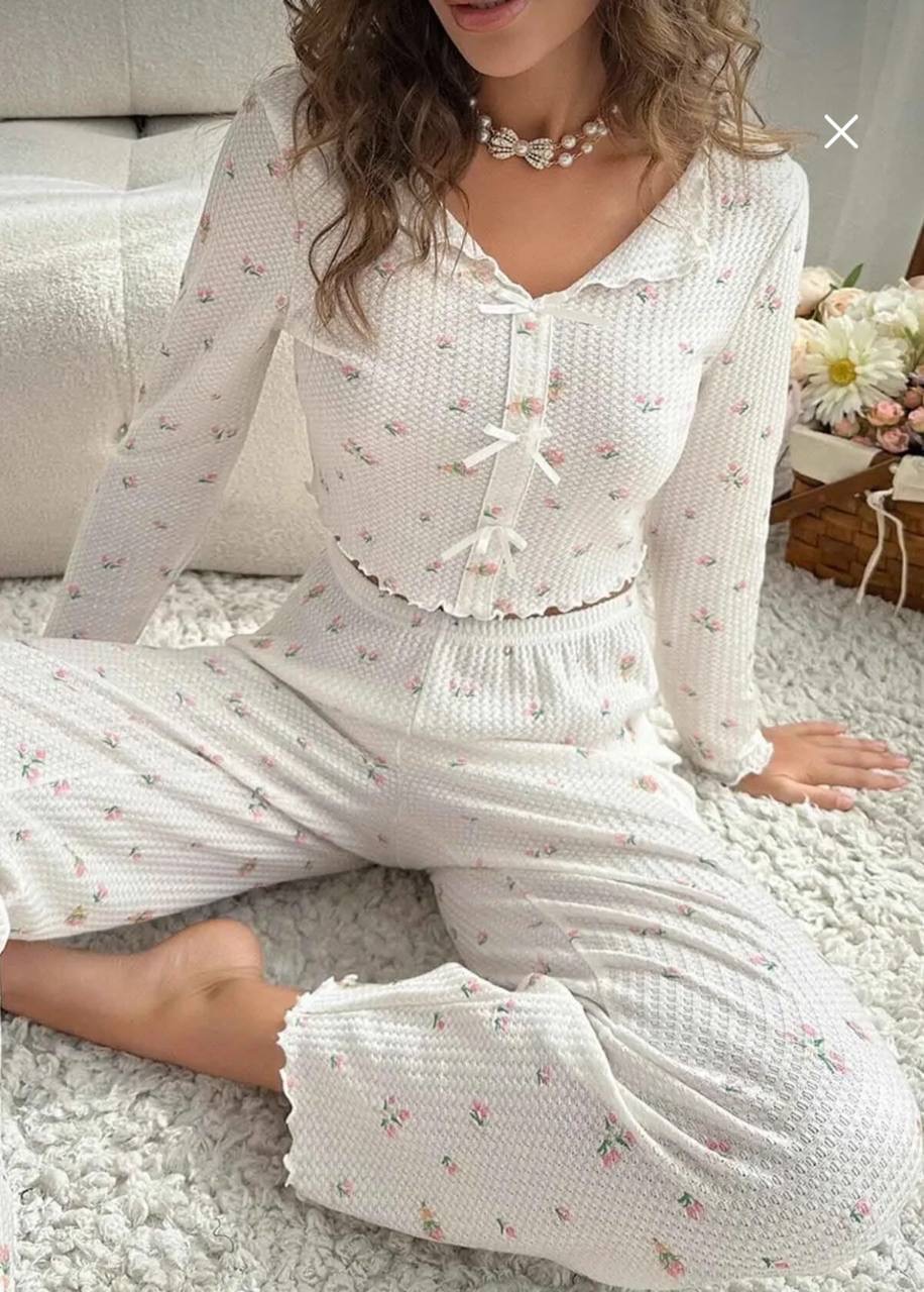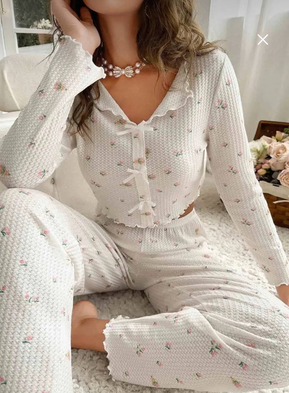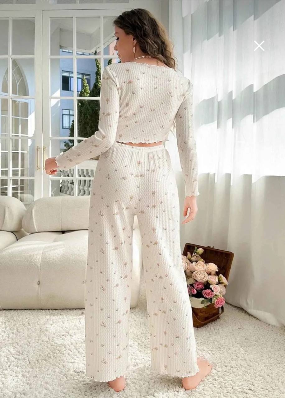 طقم قطعتين بيجامه من القماش المحبوك المخصص بتصميم انيق وطبعه الزهور